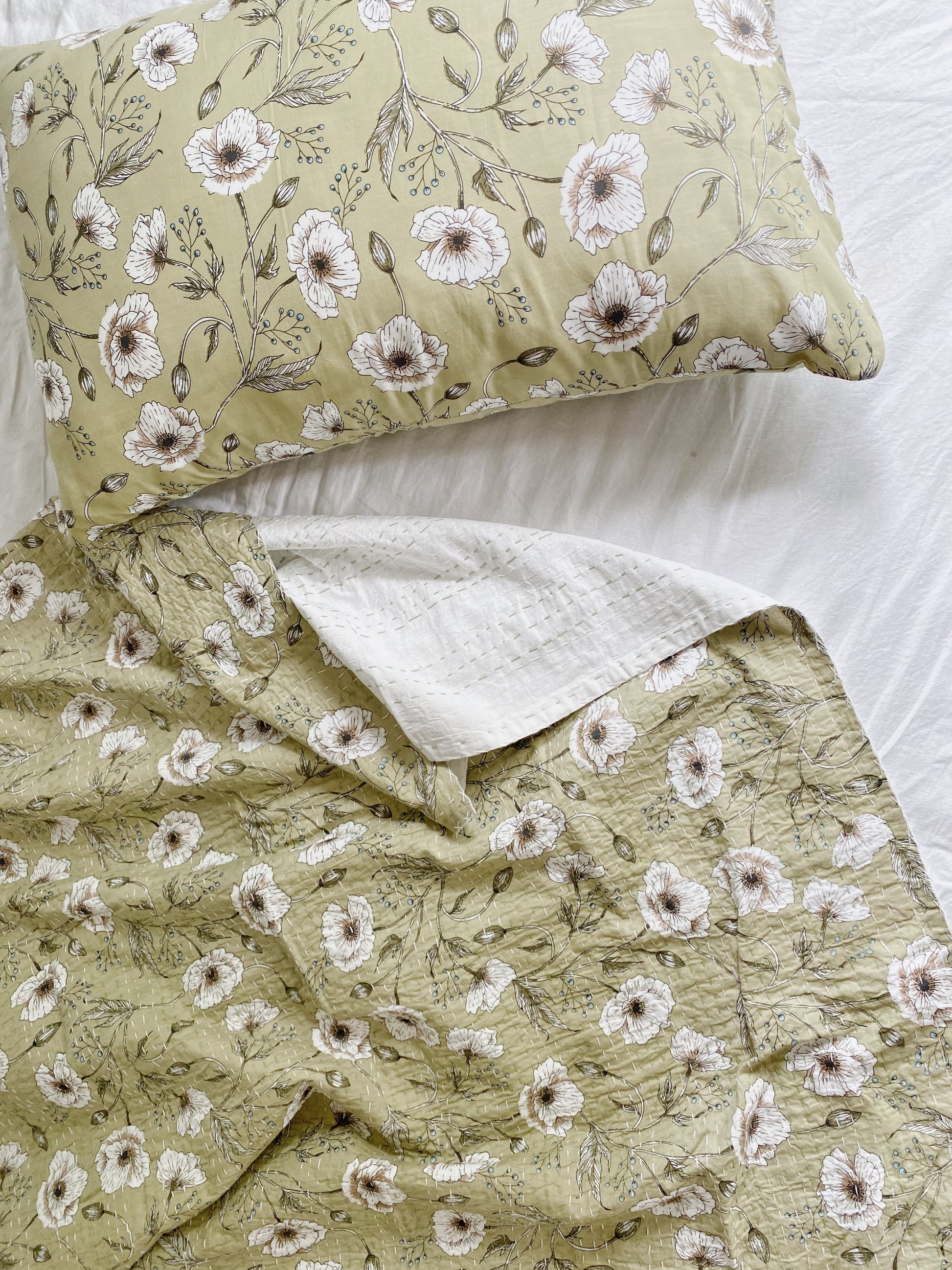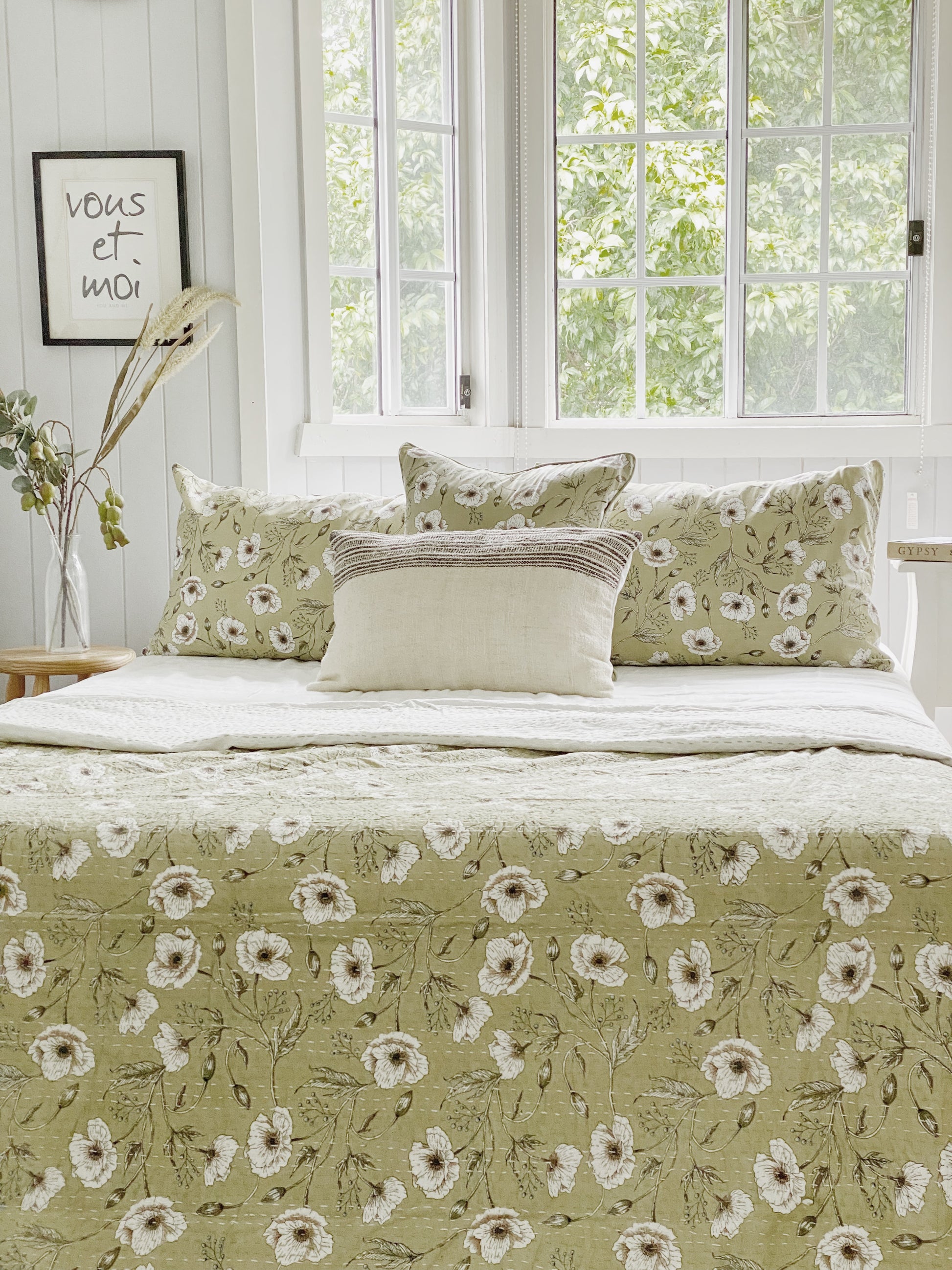 Poppies strewn over a sublime sage background with a sprinkling of leaves and buds - Adele Poppy is sure to lift any room to a coastal, tranquil ,artful escape .