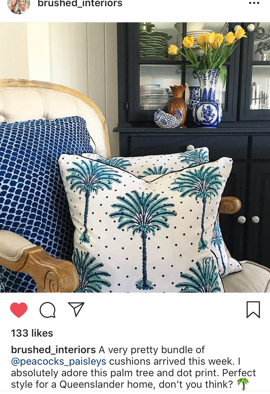 Bring the Hamptons home with this tropical print .This cushion cover is hand block printed by Indian artisans .The block print detail is stunning in this design .