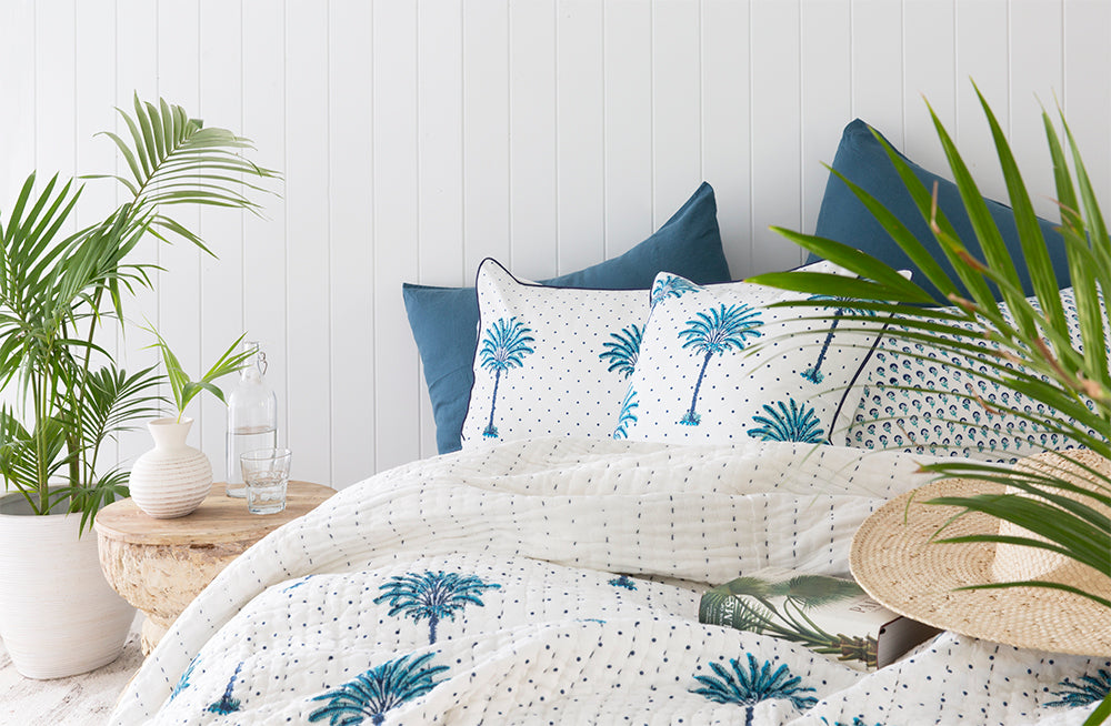 Bring the Hamptons home with this tropical print .This cushion cover is hand block printed by Indian artisans .The block print detail is stunning in this design .