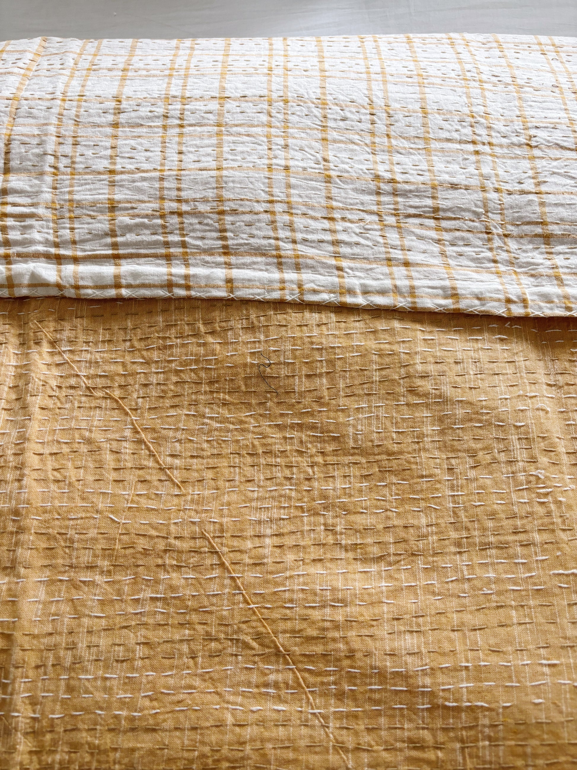 Designed keeping the Coastal living in mind , this kantha quilt is reversible and features plain citrine yellow on one side and a coastal check on the other side .