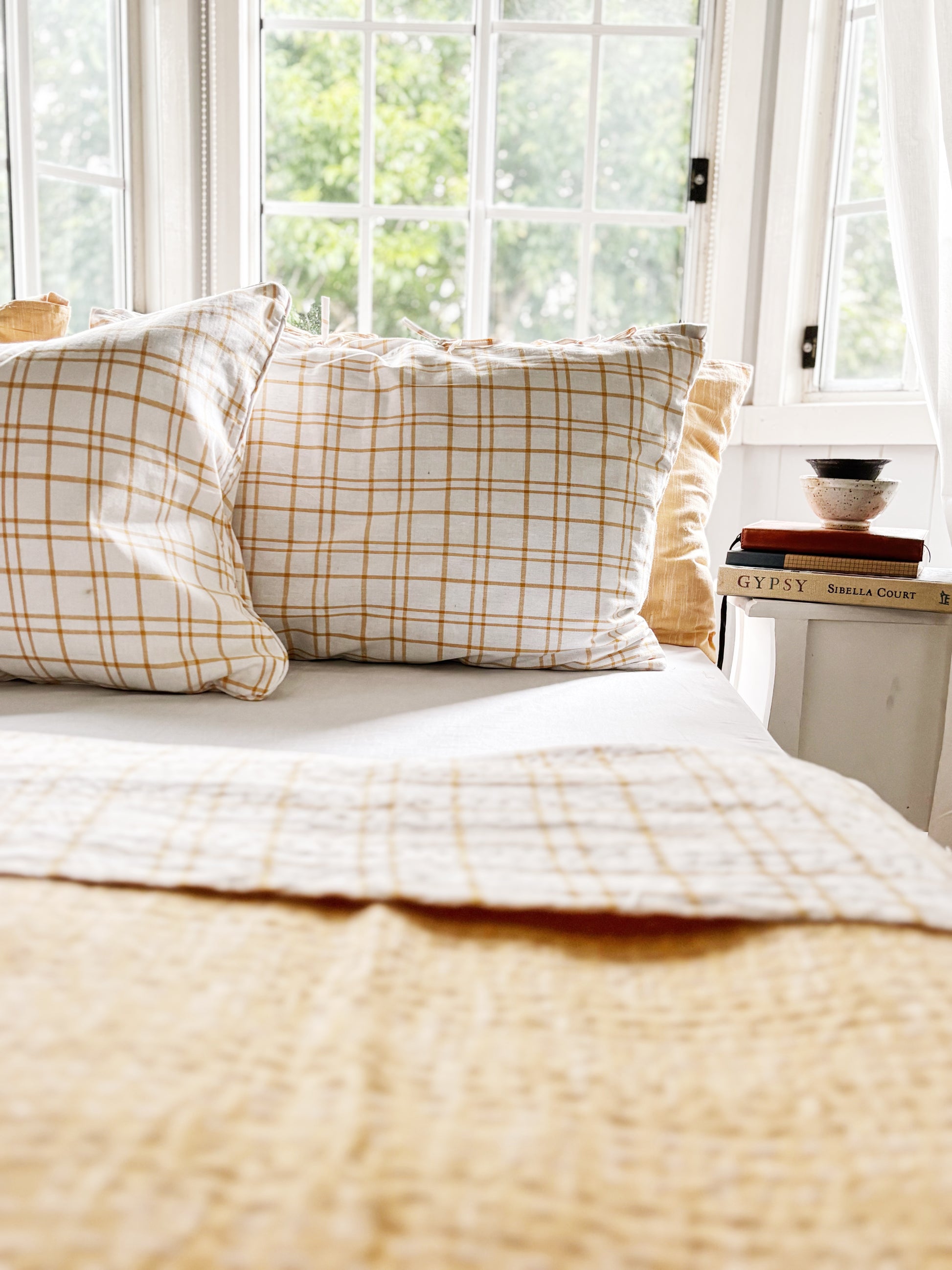 The minimalist check pattern on one side and nature-inspired citrine yellow on the other creates a calming, organic look that pairs well with light wood, woven textures, and other earthy colours.