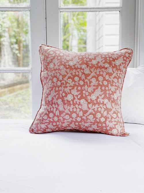 A floral pattern dipped in dusty pink this cushion cover can be mixed and matched with almost all of our existing designs . Hand block printed by skilled artisans .