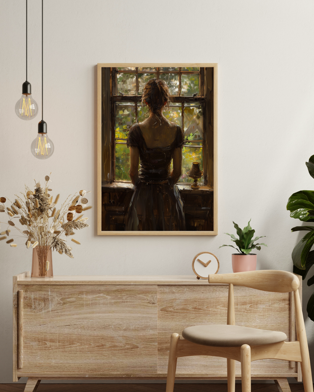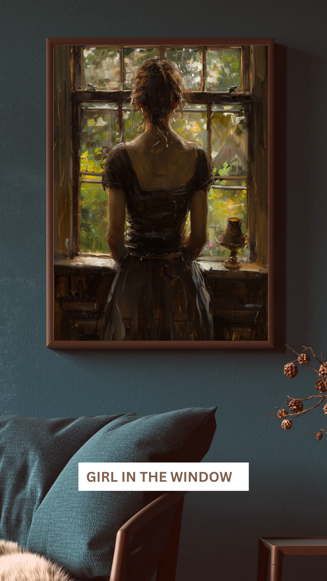 This beautiful, originally-designed Vintage Aesthetic "Girl in The Window" digital art print is the perfect way to brighten up a room and add some personality. It reflects a vintage ,European , Parisian, antique, and organic style, and makes for the perfect decor for entryways, living rooms, bedrooms, kitchens, bathrooms, dorms, and more!