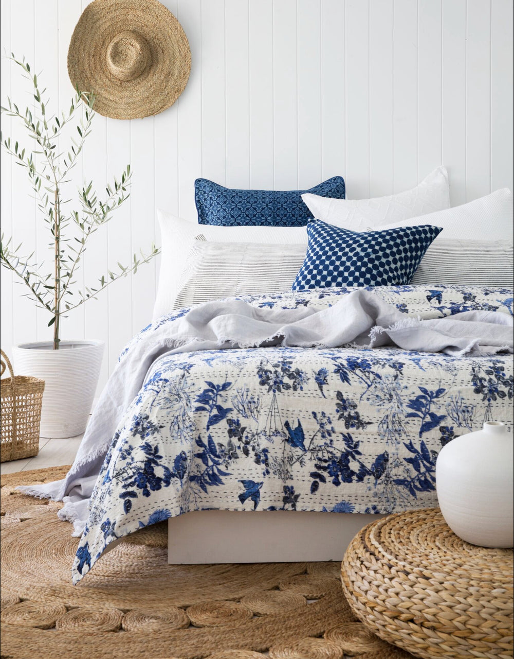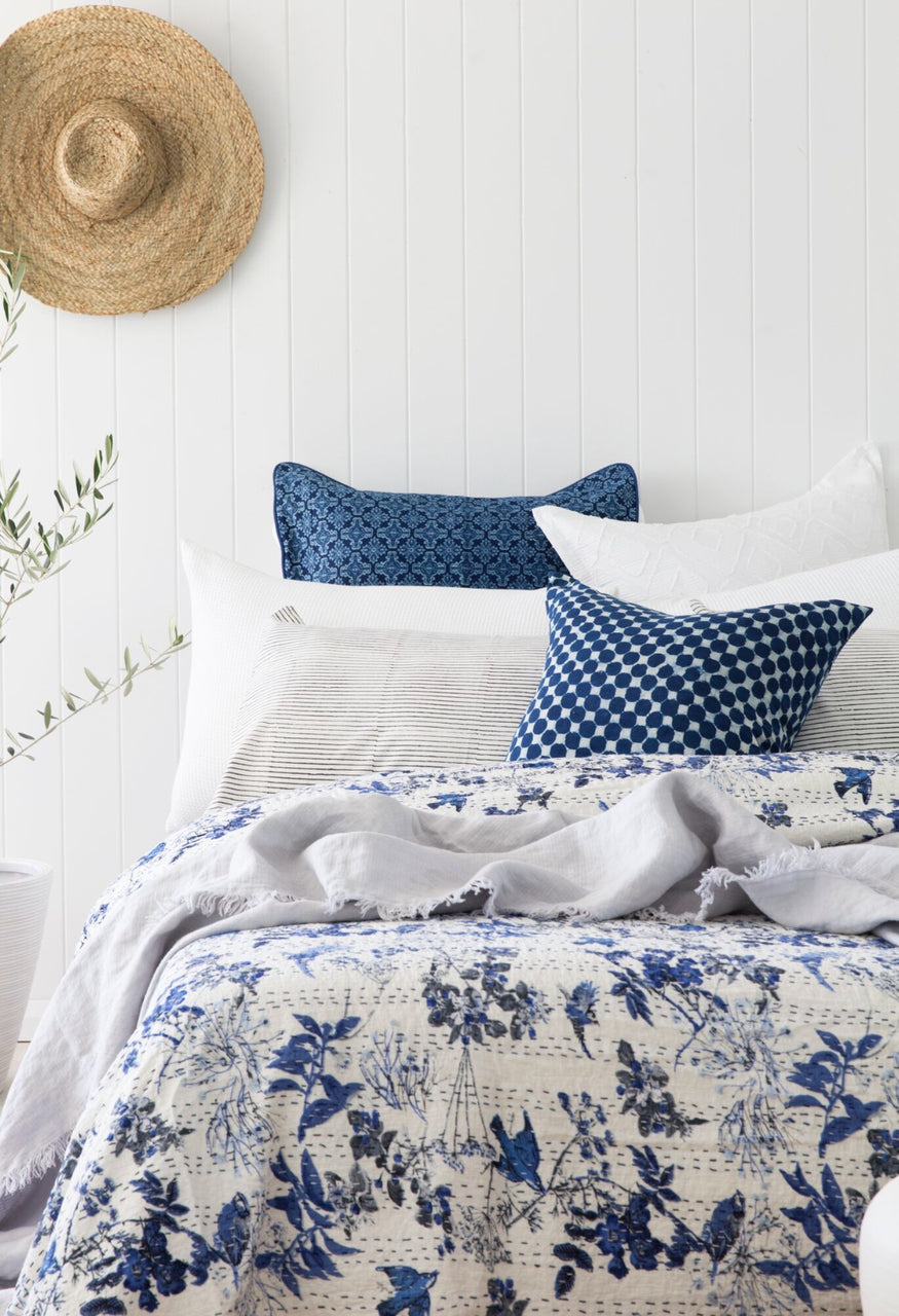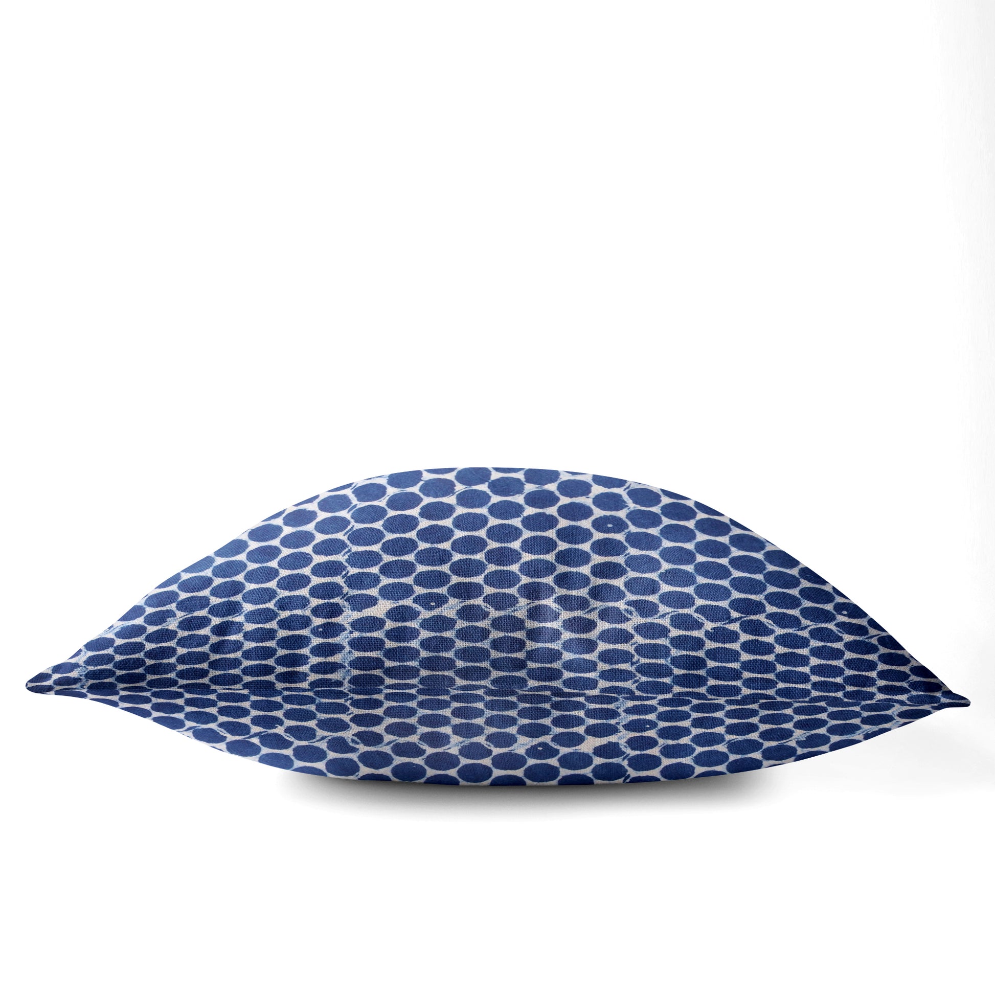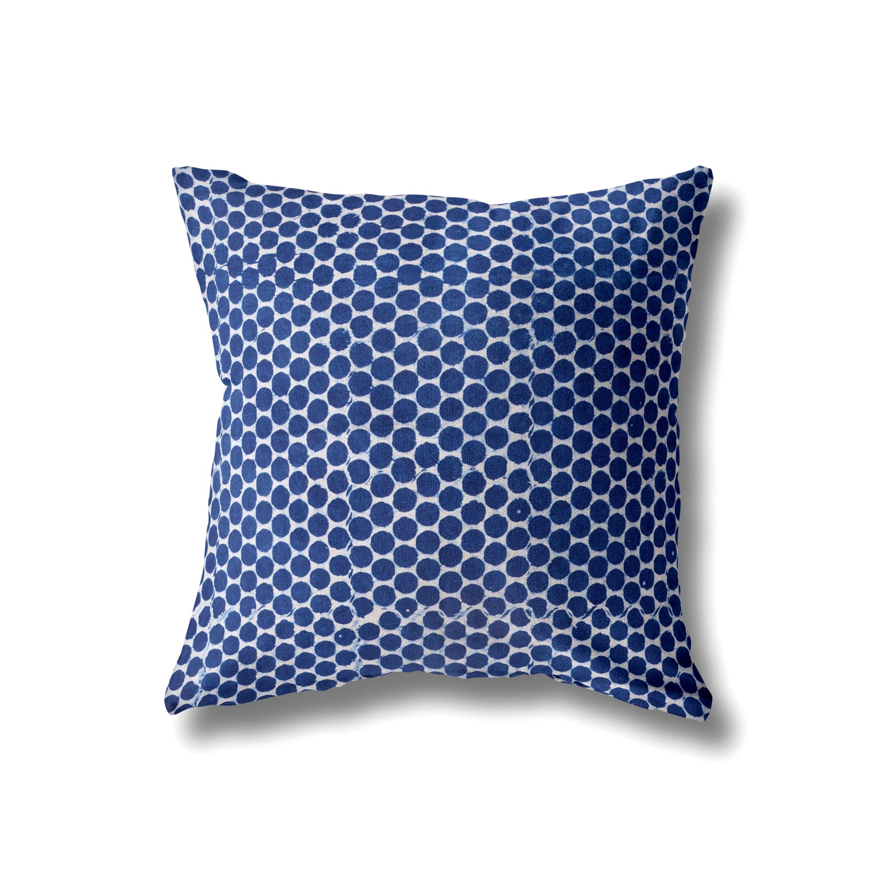 Classic polka dots on an Indigo background . Pair it up with our other Indigo covers on a neutral/white couch for a Hamptons look or mix it up with pinks , mints and mauves for an eclectic bohemian vibe . Handprinted on the softest cotton it is lined with muslin throughout to give it more strength .