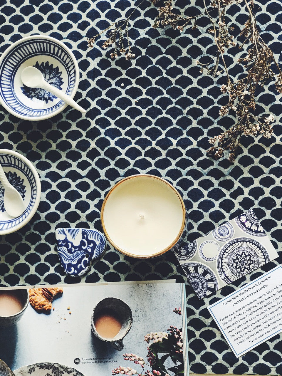This tablecloth is hand block printed by artisans in India using carved wooden blocks.Each piece is a work of art and is slightly different from others as it carries with it the distinct imprint of that particular lot of dye and the artisan who made it .