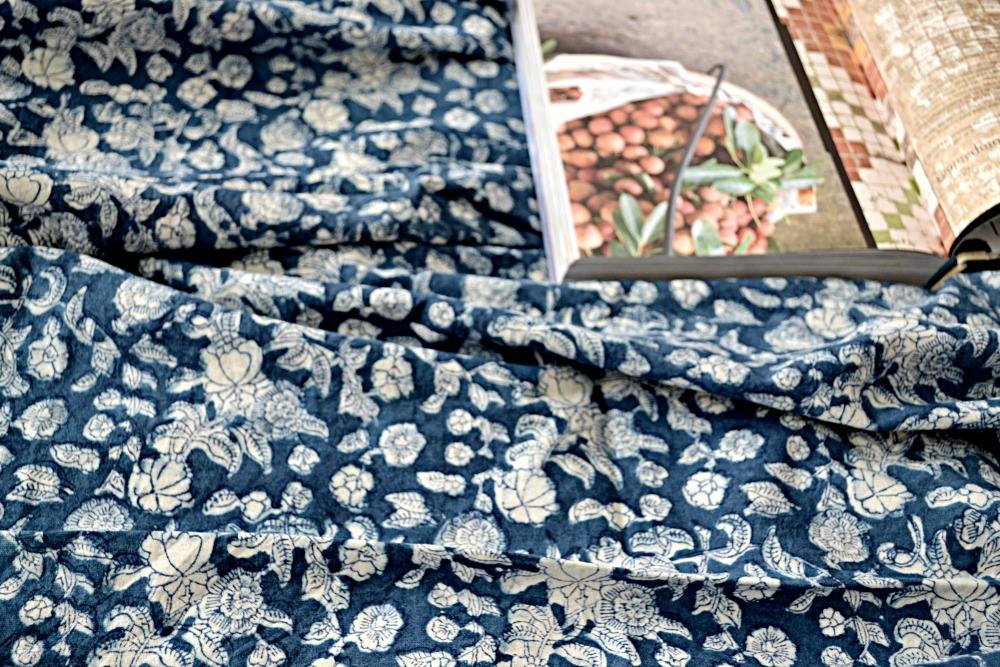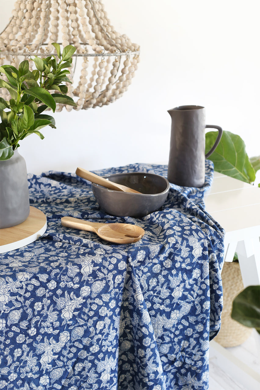 This tablecloth is hand block printed by artisans in India using carved wooden blocks.Each piece is a work of art and is slightly different from others as it carries with it the distinct imprint of that particular lot of dye and the artisan who made it .