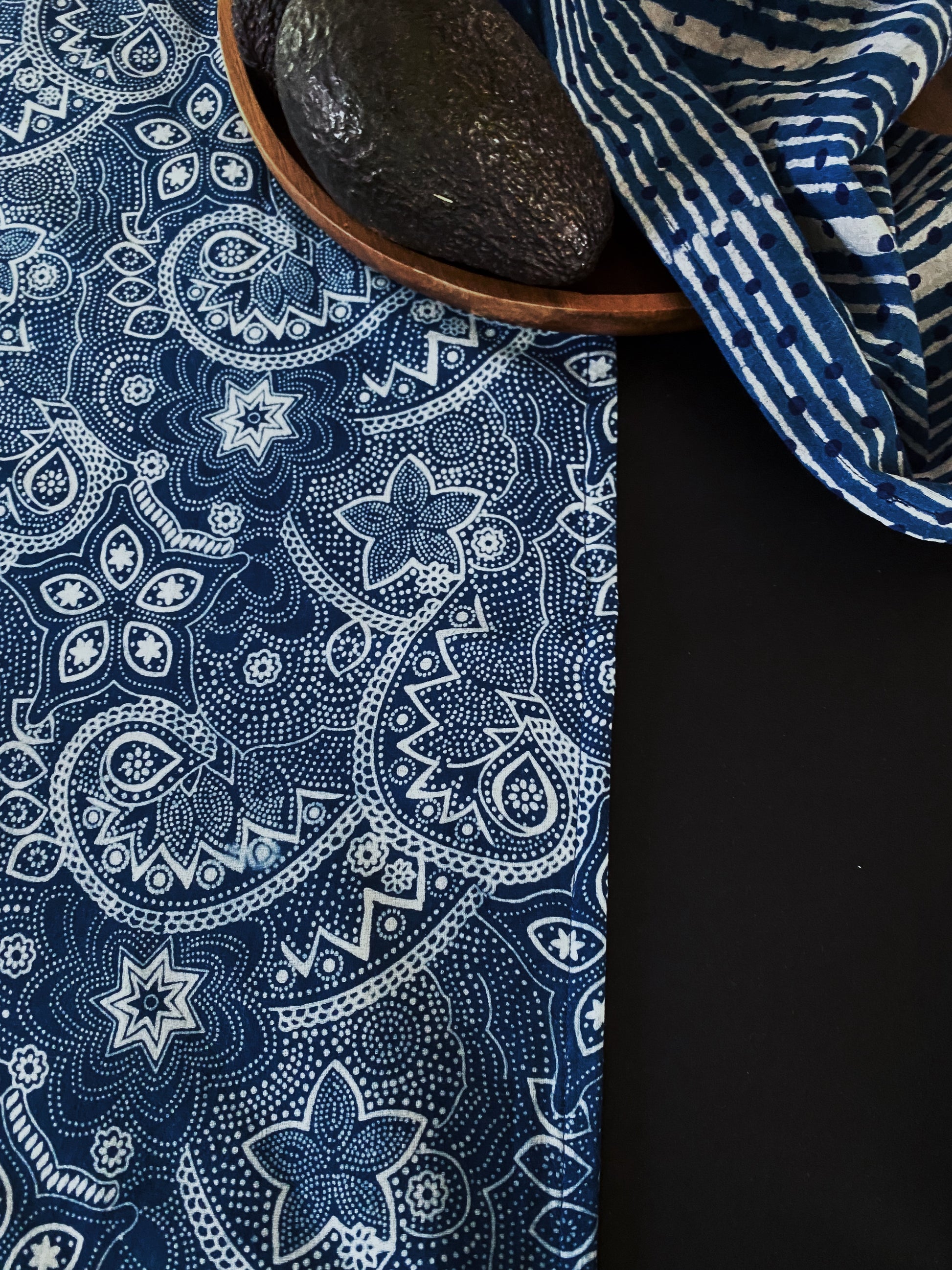 This table runner is screen printed printed by artisans in India .Each piece is a work of art and is slightly different from others .
