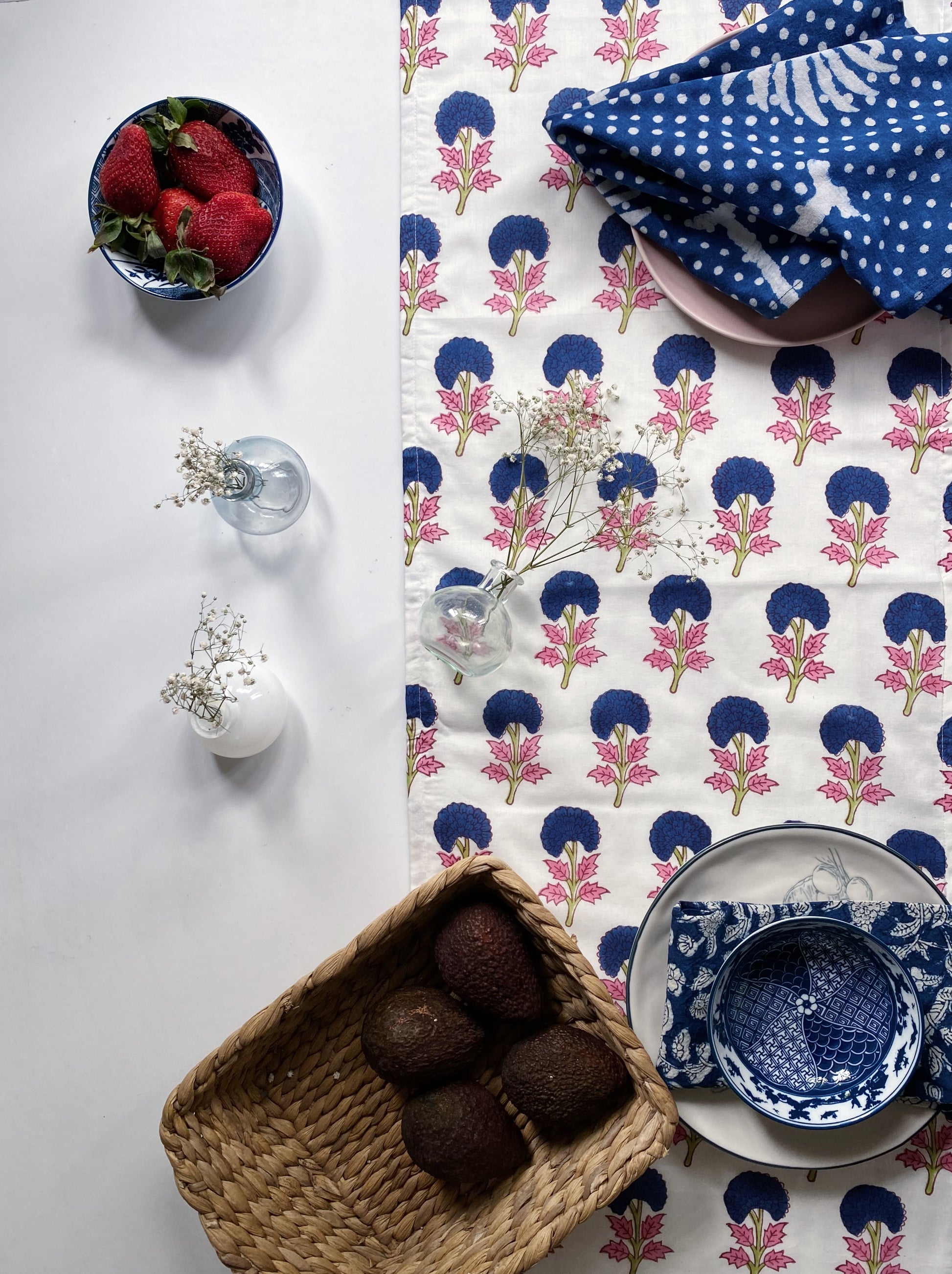 This table runner is hand block printed by artisans in India using carved wooden blocks.Each piece is a work of art and is slightly different from others as it carries with it the distinct imprint of that particular lot of dye and the artisan who made it .