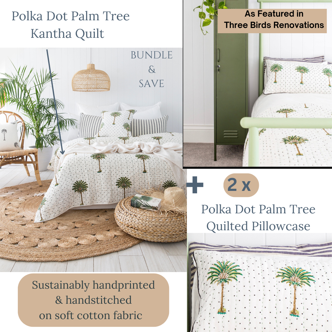 Polka Dot Palm Tree Kantha Quilt plus Quilted Pillowcase Bundle