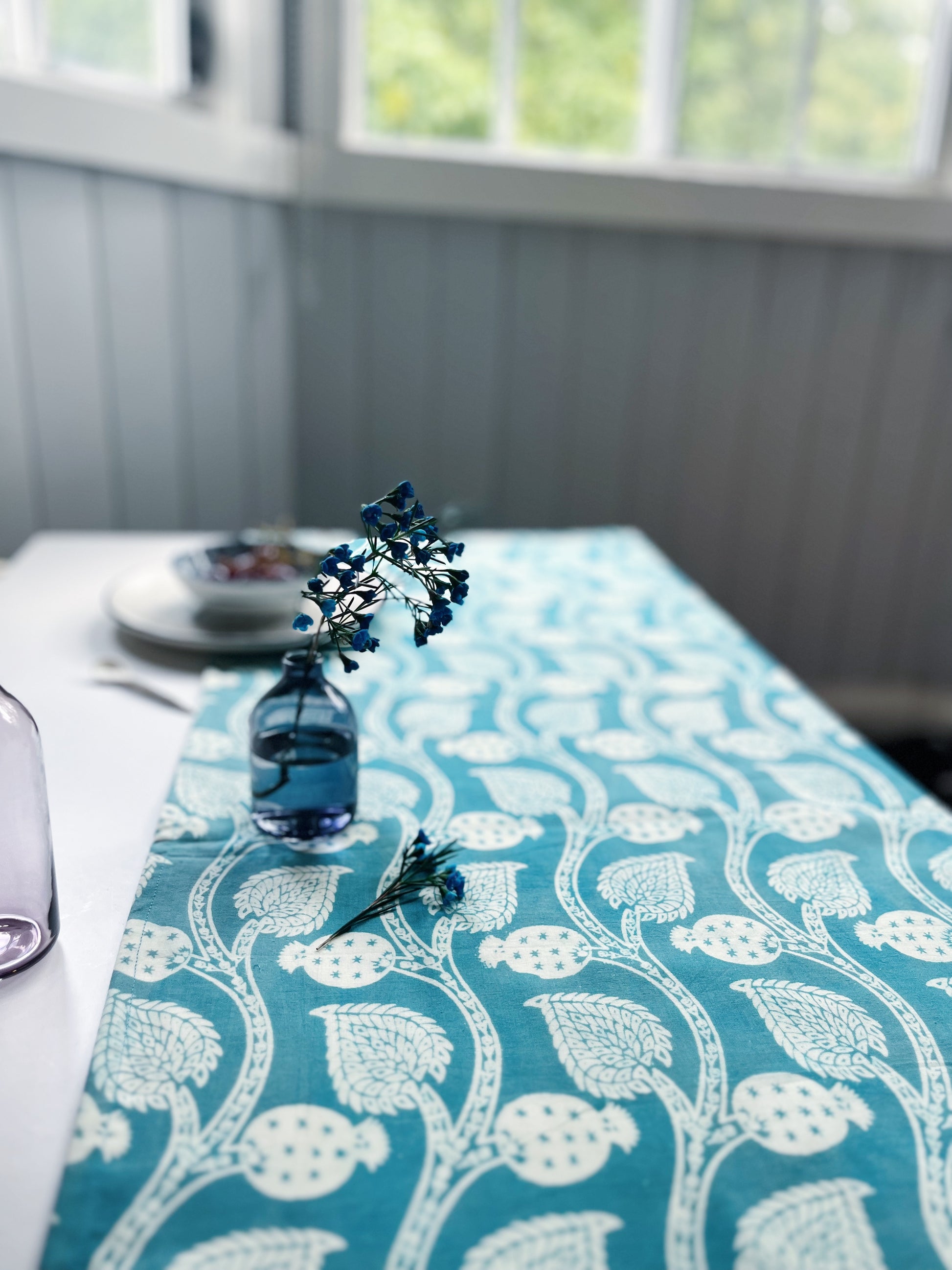 This table runner is screen printed printed by artisans in India .Each piece is a work of art and is slightly different from others .