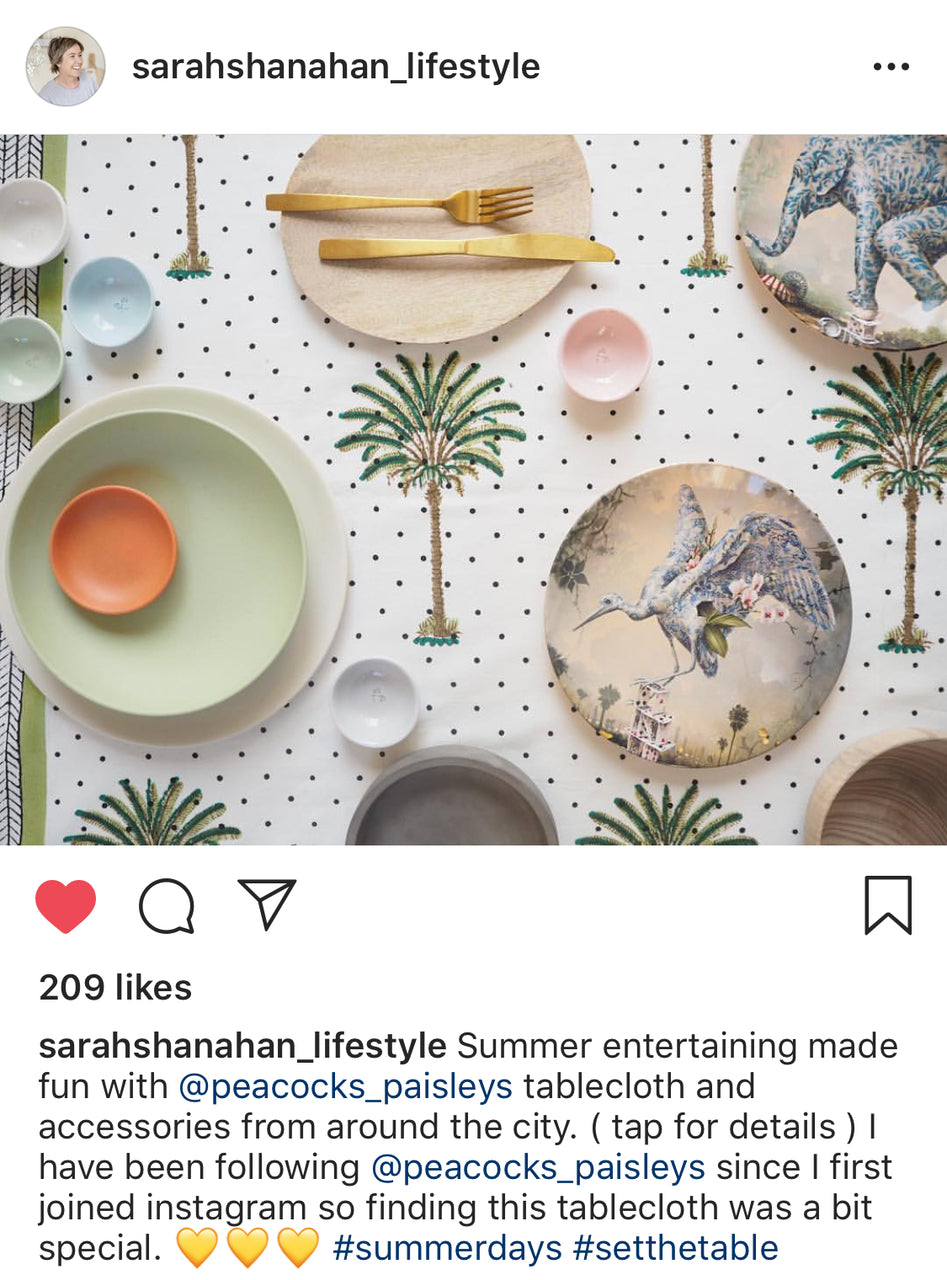 PEACOCKS AND PAISLEYS7 months agoSo glad you like our products . We are chuffed that our aesthetic reminds you of the lovely India Hicks Style . Sadly we are currently out of stock for the Polka Dot Palm Tree matching napery but we do have the Boho Scandi Spot Napkins in stock which go very well with this tablecloth . We hope the tablecloth brings you heaps of joy !!