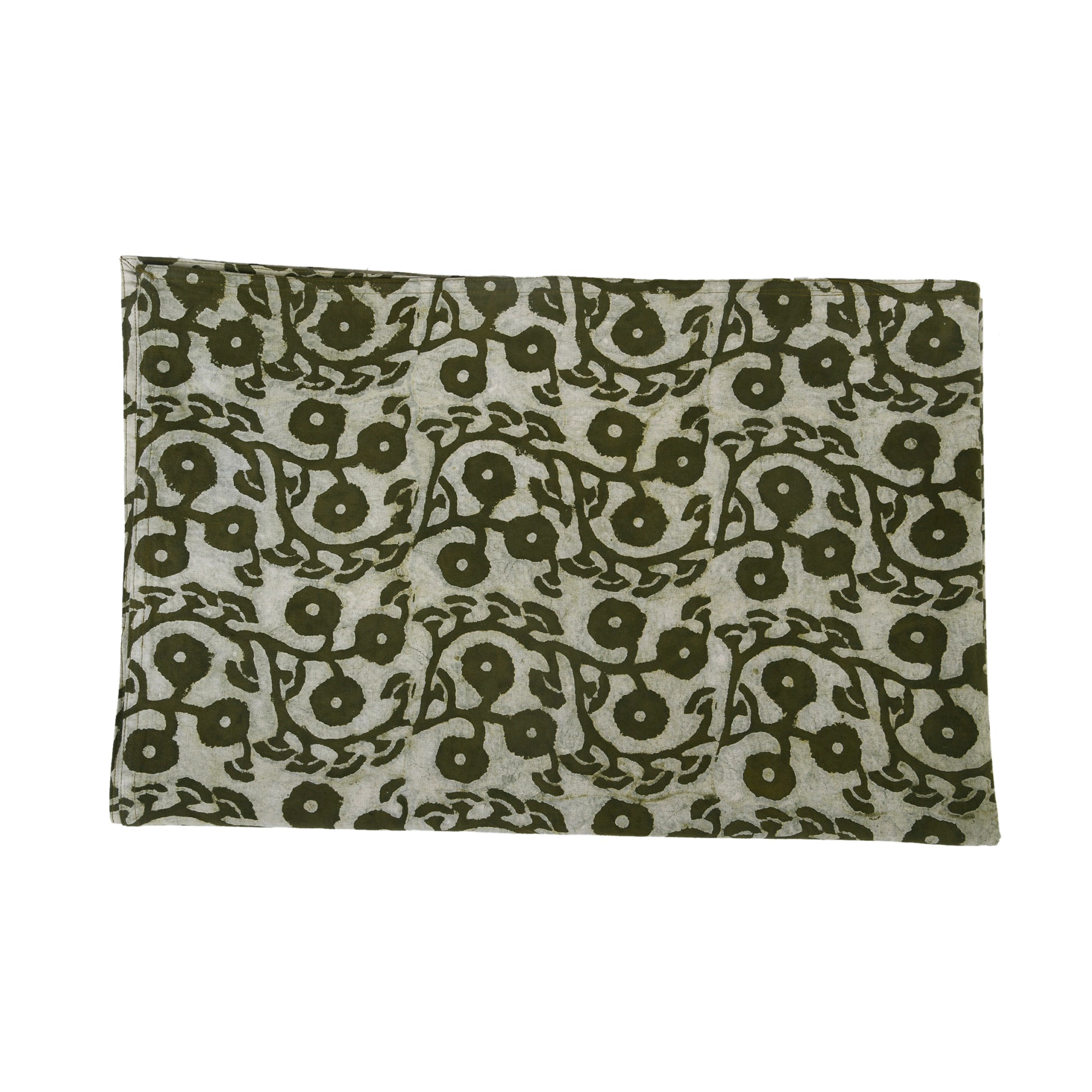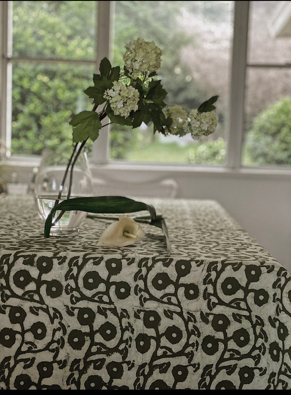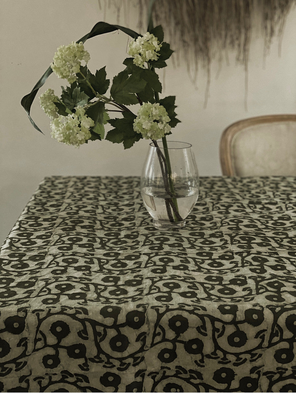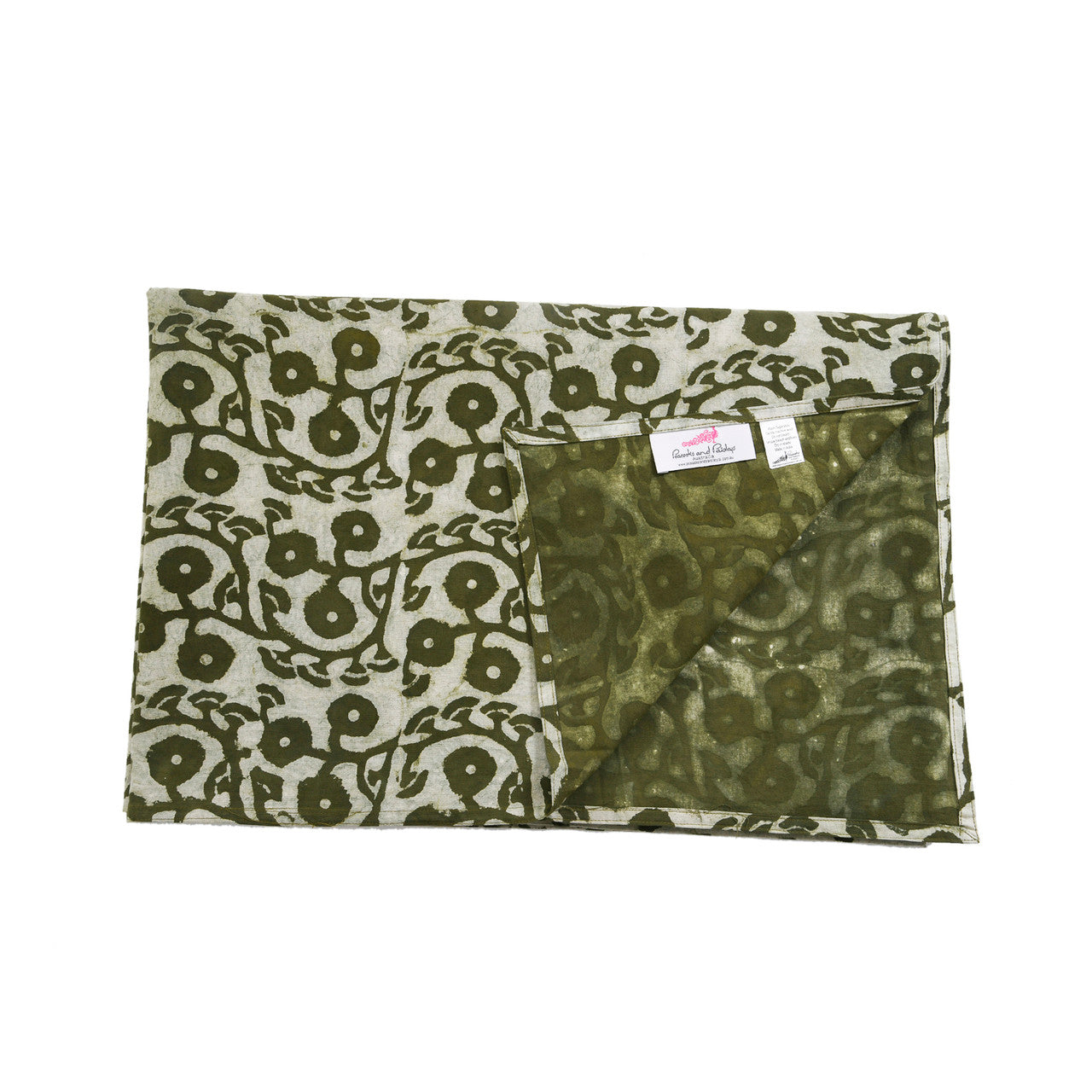 This tablecloth is hand block printed by artisans in India using carved wooden blocks.Each piece is a work of art and is slightly different from others as it carries with it the distinct imprint of that particular lot of dye and the artisan who made it .