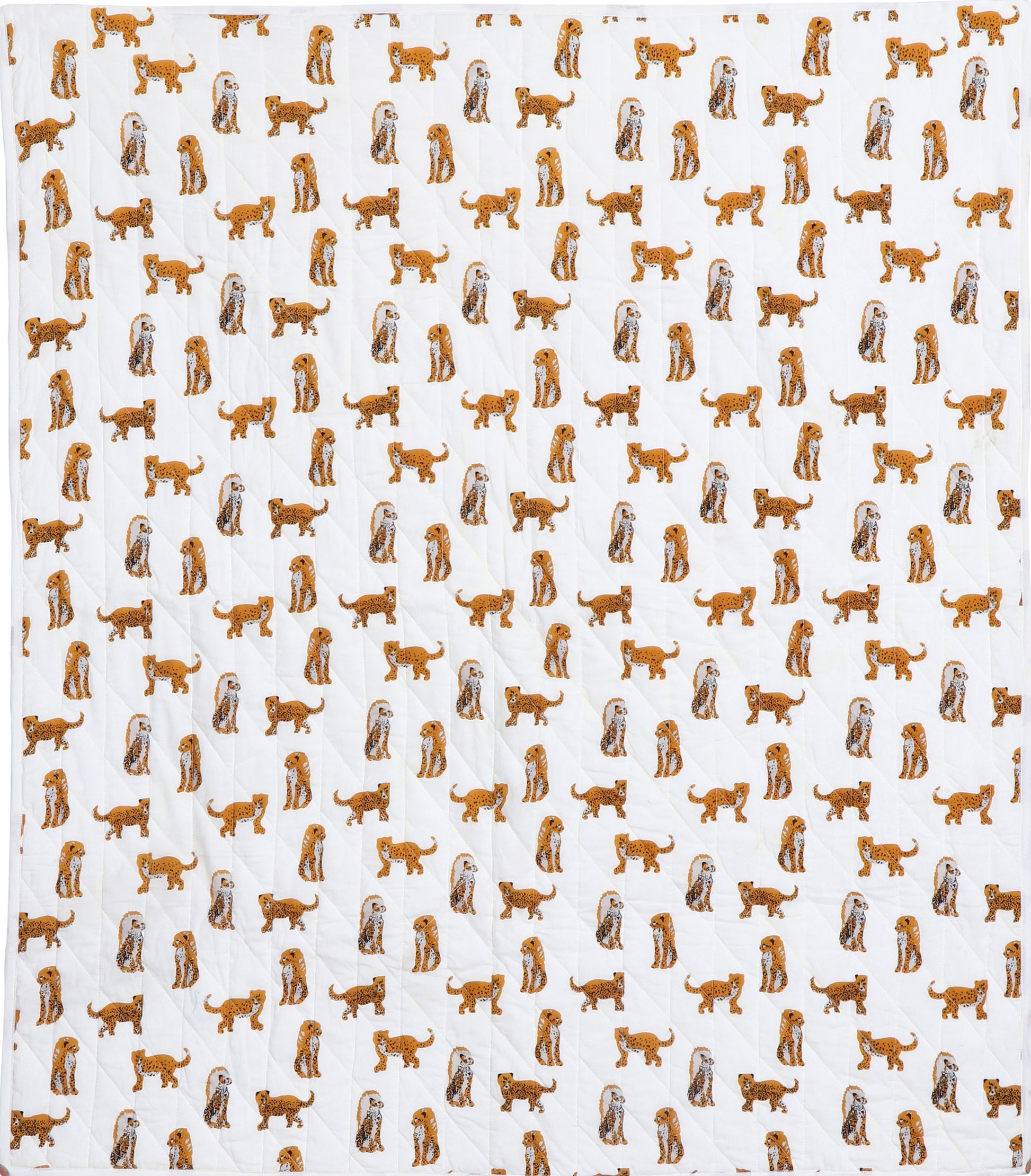 For a little jungle and animal lover we created the Sahara Leopard baby quilt . It is hand screen printed on the softest cotton fabric and machine quilted .