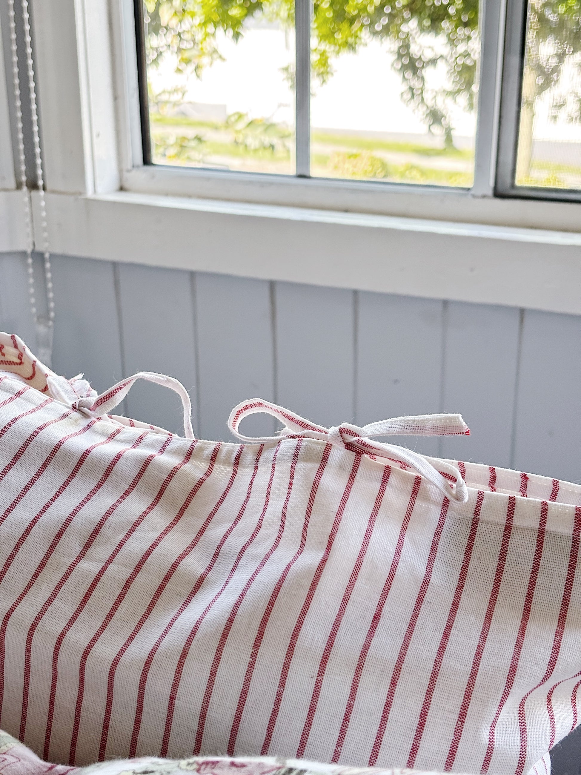 Machine woven and lined by muslin throughout with European inspired fabric ties .