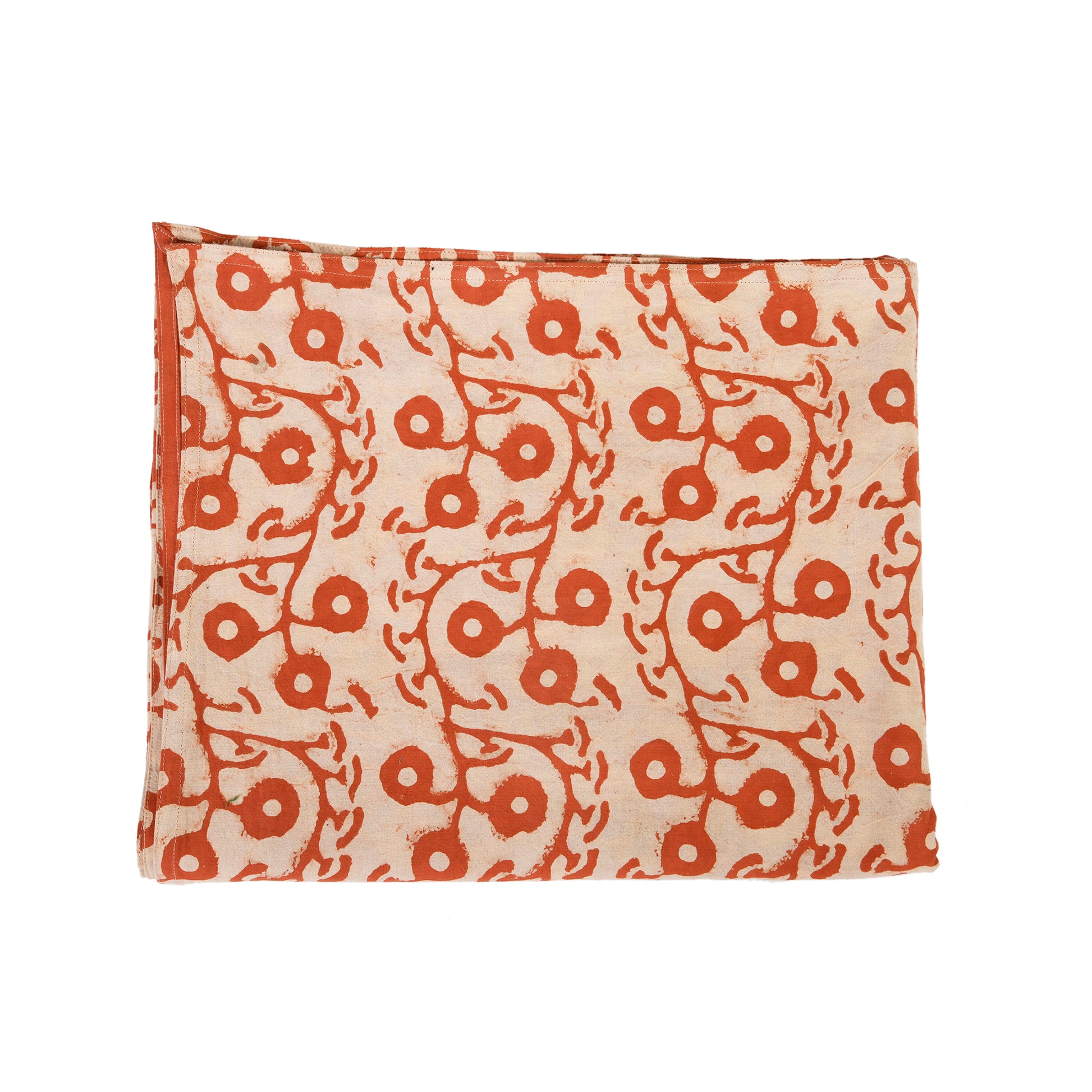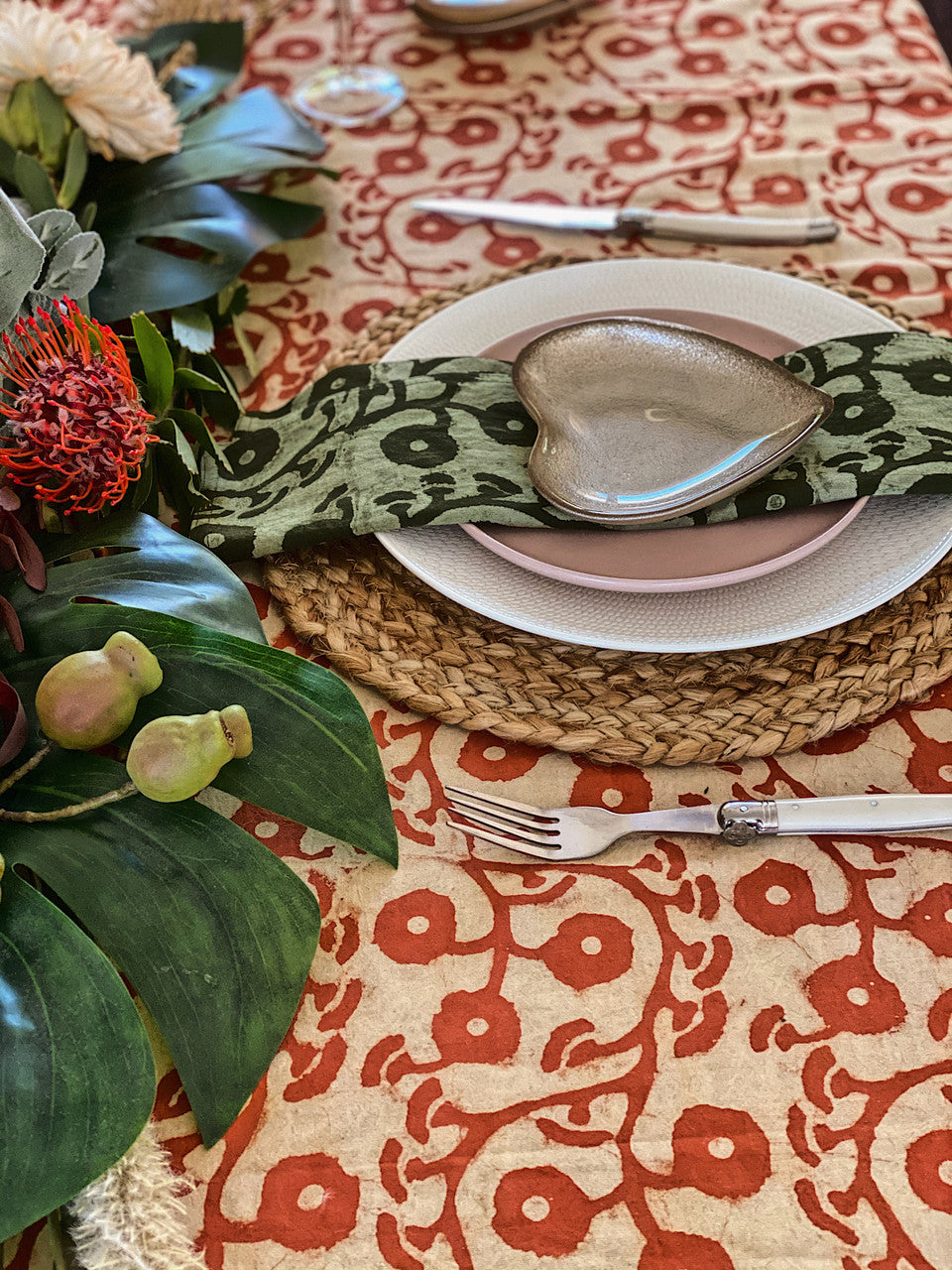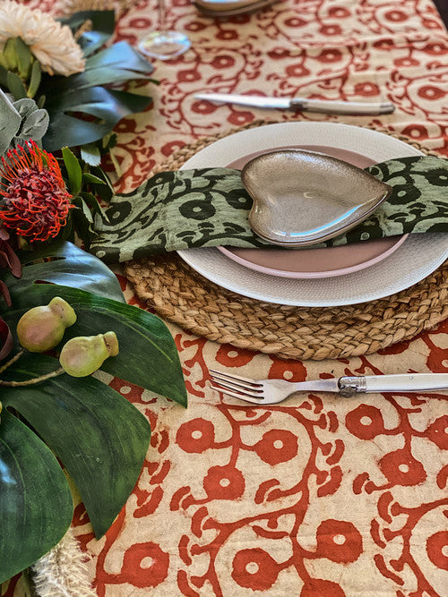 This tablecloth is hand block printed by artisans in India using carved wooden blocks.Each piece is a work of art and is slightly different from others as it carries with it the distinct imprint of that particular lot of dye and the artisan who made it .